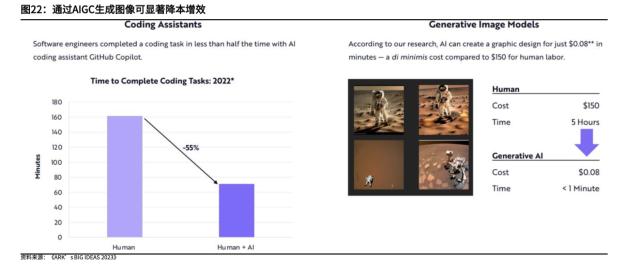 根据ARK Investment预测,AIGC所带来的生产力提升会推动全球IT总支出CAGR从4% 提升至20%。预计到2030年,人工智能将为全球创造16万亿美元的经济贡献。