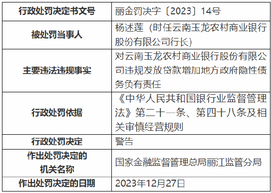 6月24日金融一线消息,国家金融监督管理总局丽江监管分局行政处罚信息公开表显示,云南玉龙农村商业银行股份有限公司因违规发放贷款增加地方政府隐性债务,被国家金融监督管理总局丽江监管分局罚款50万元;同时,一名相关责任人被警告。