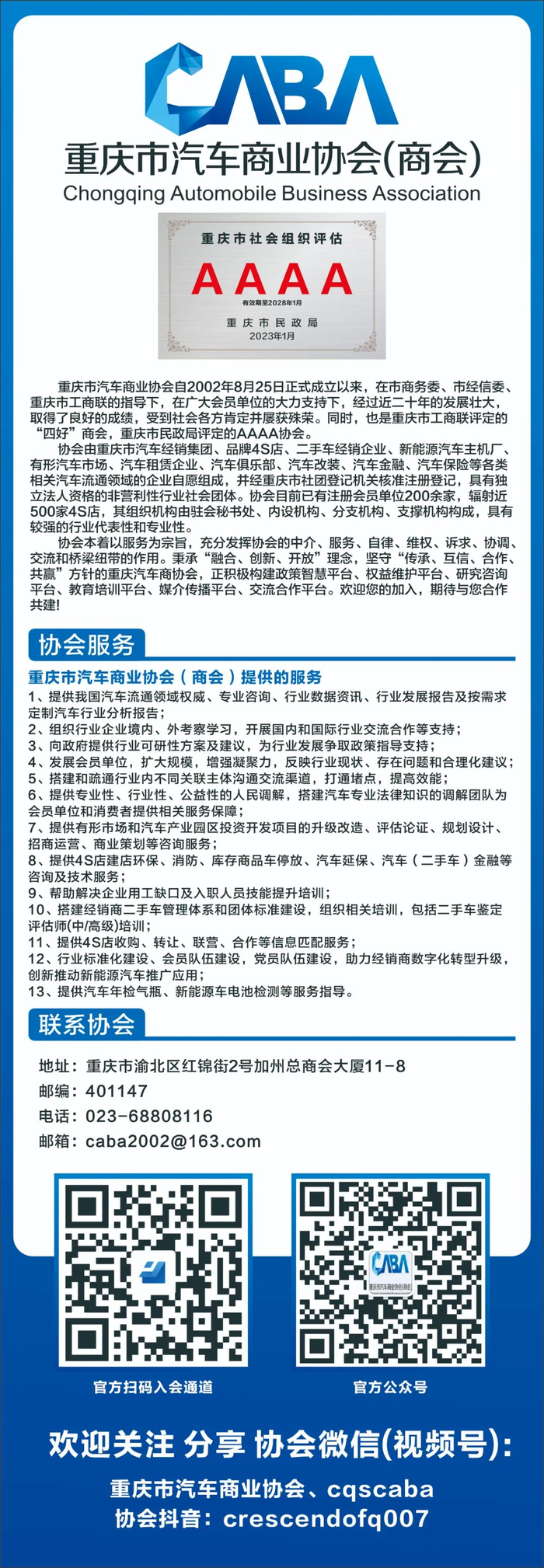 最后,杨奕会长呼吁各经销商应积极转型应对当前车市变化,精简品牌战略,做好企业管理。借助协会平台,加强合作,形成产业链的强大合力,整合资源抱团发展,共同促进重庆汽车市场繁荣发展。