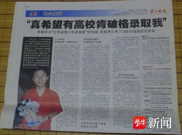 前不久,扬子晚报记者来到刘峰的公司,这位青年商业领袖回忆起往昔:“感谢2008年扬子晚报的报道,让我体验了一把上头条’的感觉。那篇报道非常有影响力,引发轰动,我也被破格录取、有学可上。”