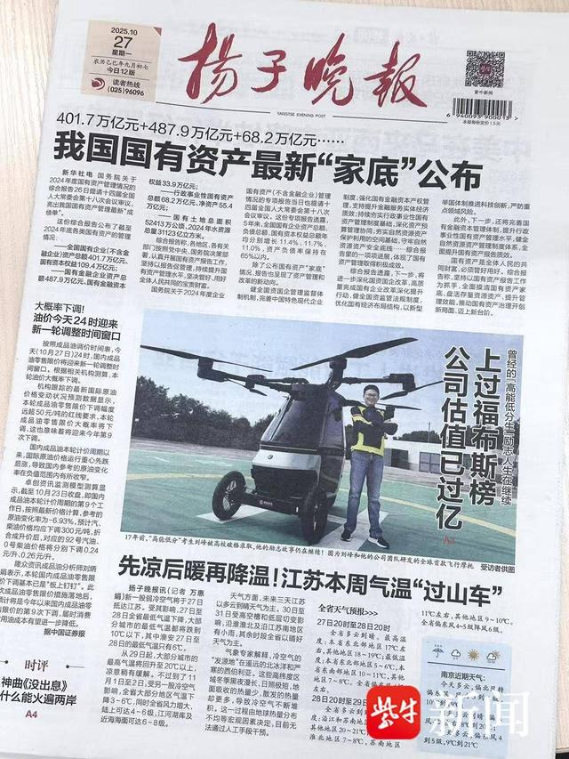 如今,他的梦想实现了吗?2025年10月27日的扬子晚报头版头条揭晓过答案——这位小伙子,毕业后在南京开了一家科技公司,研发出全球首款空心轮平衡车、大载重无人机、电动冲浪船以及飞行摩托等创新产品。
